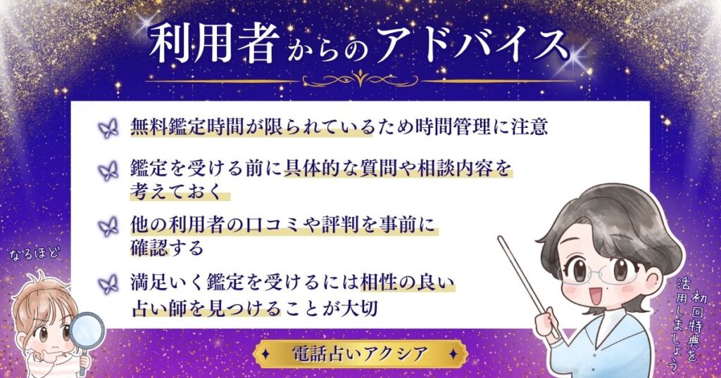 また電話占いアクシアの初回無料特典を利用する際に関する注意点を、以下にまとめました。初回無料特典を利用する際には以下の項目に気を付けてサービスを受けるようにすると万全です。