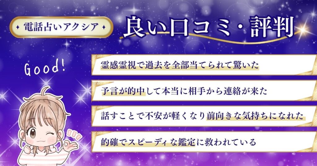この記事では、電話占いアクシアの口コミで当たると評判の先生や、利用者の方の口コミ評判などを詳しく説明しました。
