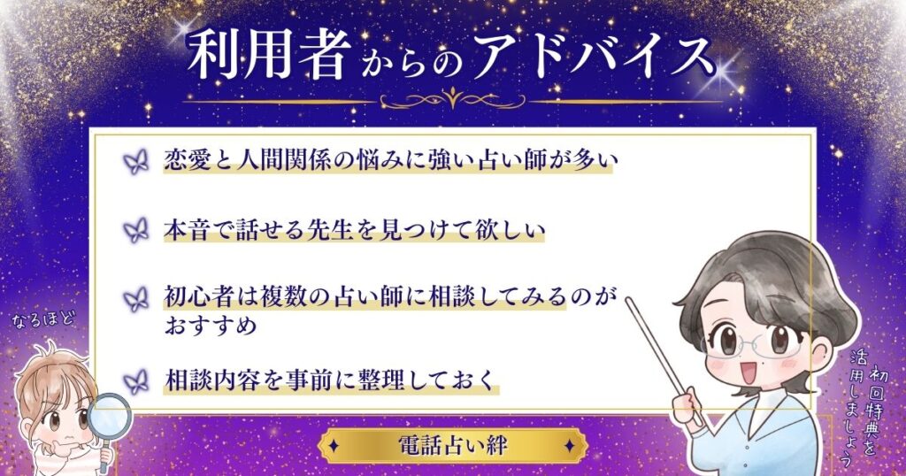 当記事はこんな方向けに、電話占い絆の評判から当たる先生までまとめていきます。