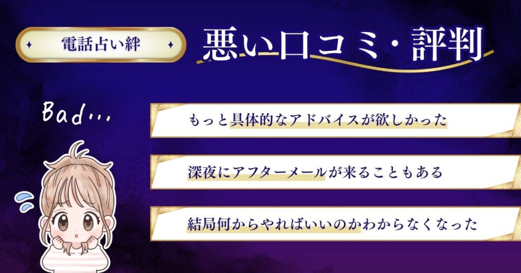 電話占い絆を利用する際の注意点として、まず在籍占い師の人数が他サイトと比べて少なめであり、多様な先生から選びたい方には物足りなさを感じる場合があります。また、鑑定歴10年未満の先生が多いため、経験豊富な占い師を希望する方は事前にプロフィールをよく確認しましょう。