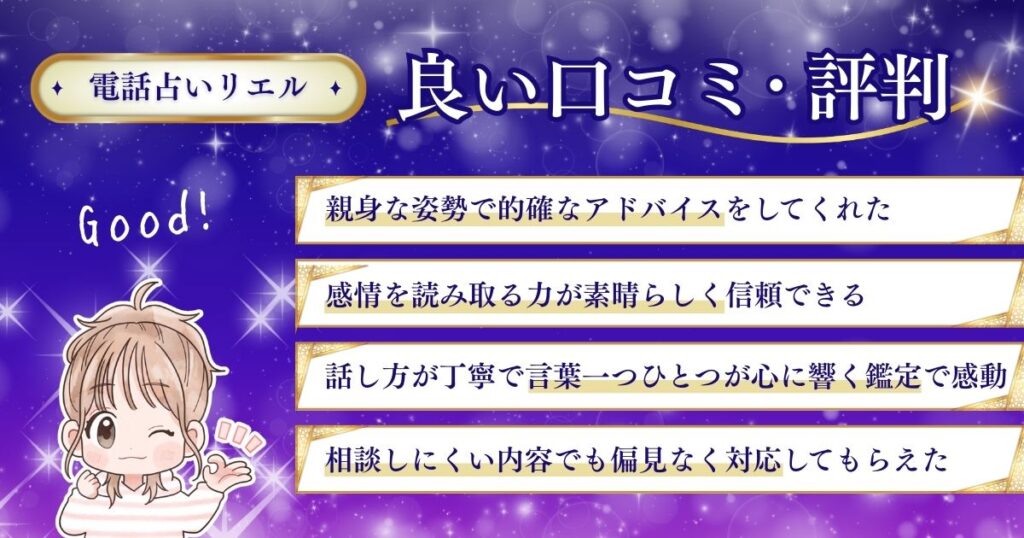 この記事では、電話占いリエルの口コミで当たると評判の先生と、口コミ評判について詳しく解説しました。