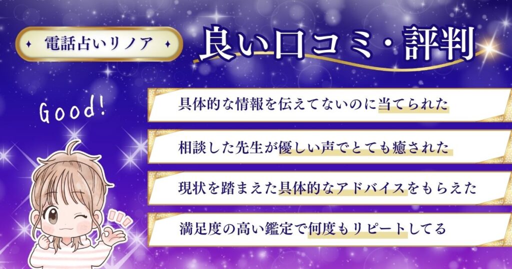 電話占いリノアの口コミ評判では「具体的なアドバイスをもらって状況が好転した」「癒されるので何度もリピートしている」という意見が多く見られ、的中率・解決力が高く満足度が高い電話占いサイトであることが分かります。