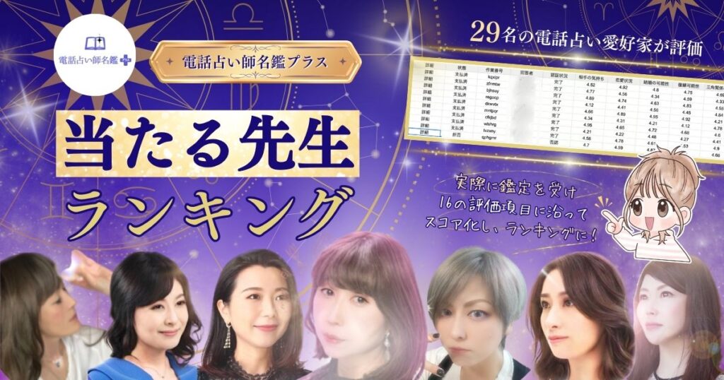 この記事では電話占い師名鑑プラスで、評判の当たる先生をランキング形式でご紹介します。また電話占い師名鑑プラスをお得に利用できる初回無料特典や、利用の仕方について詳しく解説しています。