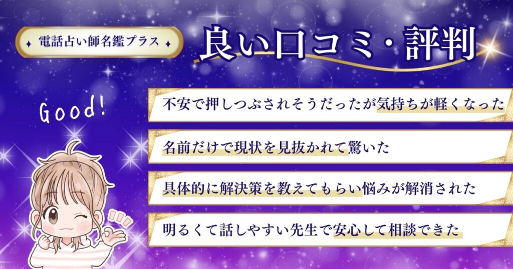 ここから各占い師の体験レポートからご紹介、口コミ評判も余すことなくまとめていくので、電話占い師名鑑プラスの先生選びの一助にしていただければ幸いです☺️