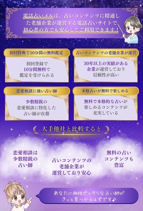 電話占いメルは、占いコンテンツに精通した老舗企業が運営する電話占いサイトで、在籍する先生方は恋愛相談に定評があります。
