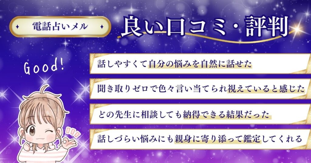 電話占いメルの良い口コミ評判では「恋愛相談をした際、話しやすくて自分の悩みを自然に話せました」「聞き取りゼロで彼の性格を言い当てられ、視えていると感じました」といった意見が多く見られました。