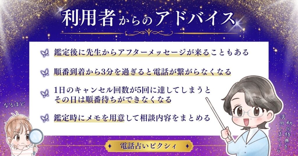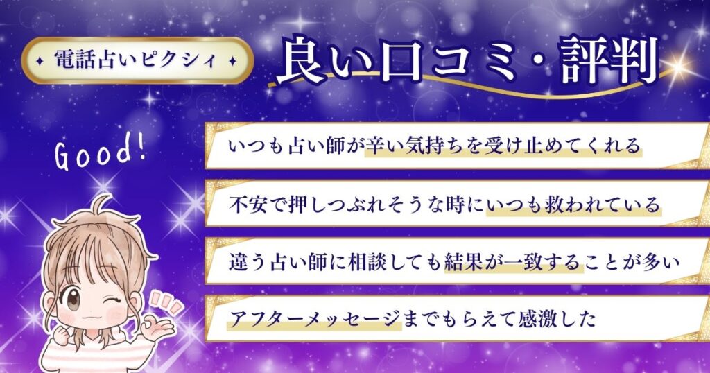 口コミや利用者の意見を見てみると「複雑な恋愛の悩みをしっかり受け止めてもらいたい方」「アフターメッセージなど細やかな心遣いの鑑定を受けたい方」に特におすすめの電話占いサイトです。
