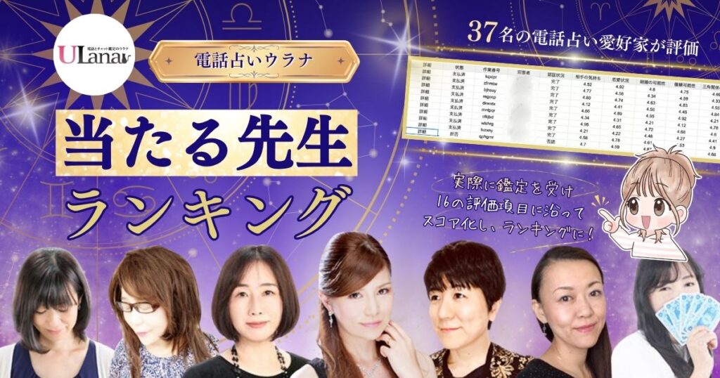 この記事では電話占いウラナの口コミで、当たると評判の先生をランキング形式でご紹介します。記事の後半では、電話占いウラナをお得に利用できる無料特典や、利用方法について解説していますので、ぜひ参考にしてみてください。
